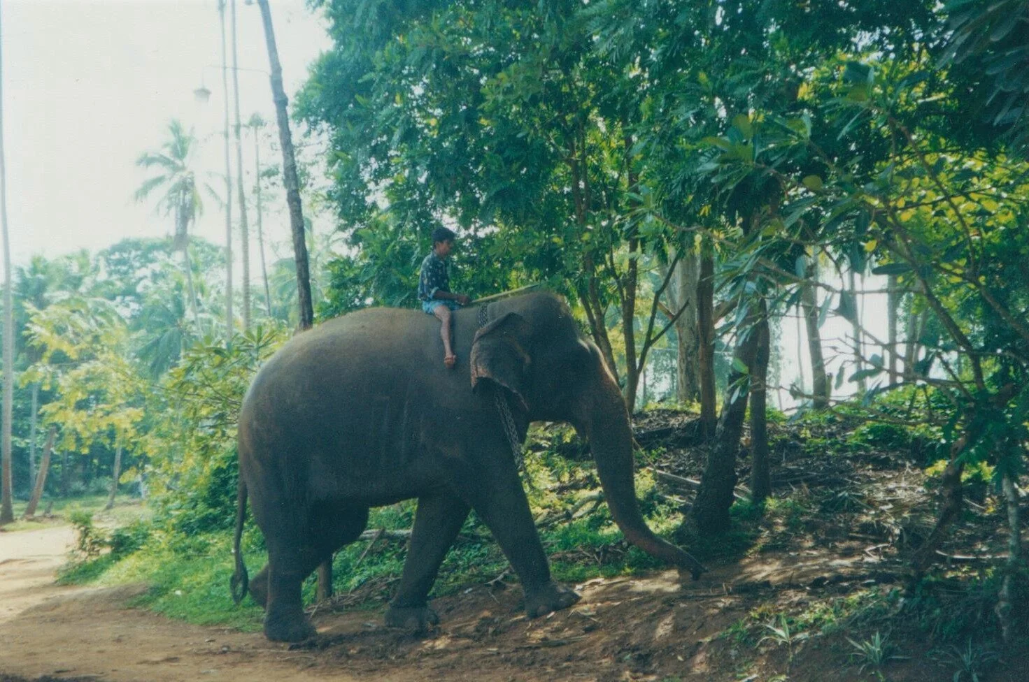 Here are two photos I took that show something of the range of their roles. In one, you see a shot of the Perahera religious festival, held in the city of Kandy each year. It features, among its many dancers and other groups, elephants in elaborately lighted costumes (the lights are operated by batteries). They are truly—almost literally—the stars of the event. Thousands of people line the street of the old capital to see them pass. The curious thing is that you can smell the elephants coming long before you see them. A bit like cattle, the smell is not a bad one, but earthy and pungent.